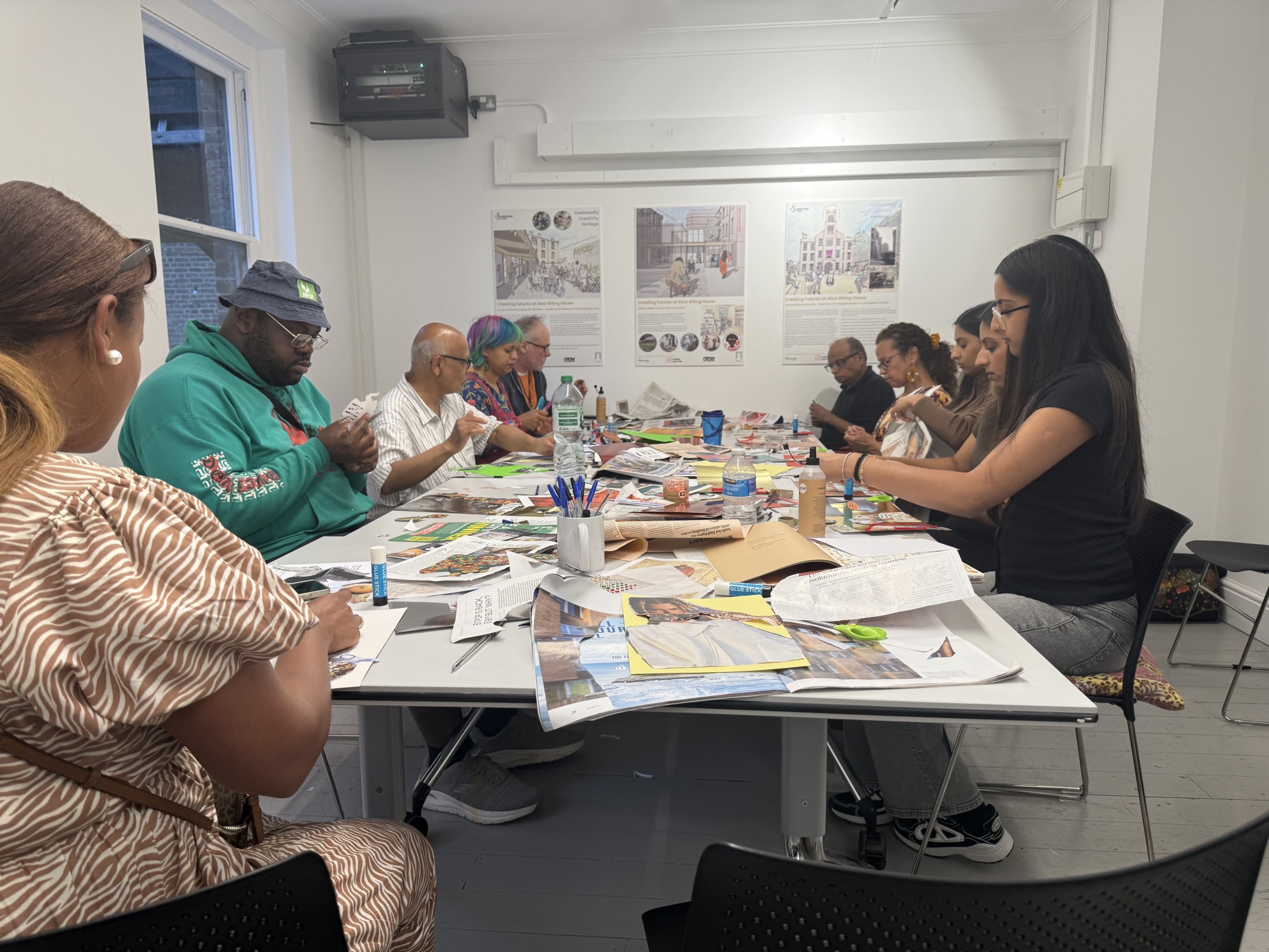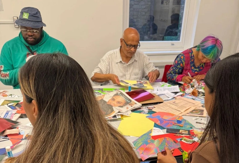 After the conversations, the group moved into making. Ramaa demonstrated a few collage techniques, then encouraged people to work intuitively and play. Materials included magazines, newspapers and bold coloured papers, with gold, silver and rose coloured cards as well as textures, materials Ramaa uses in her own practice.